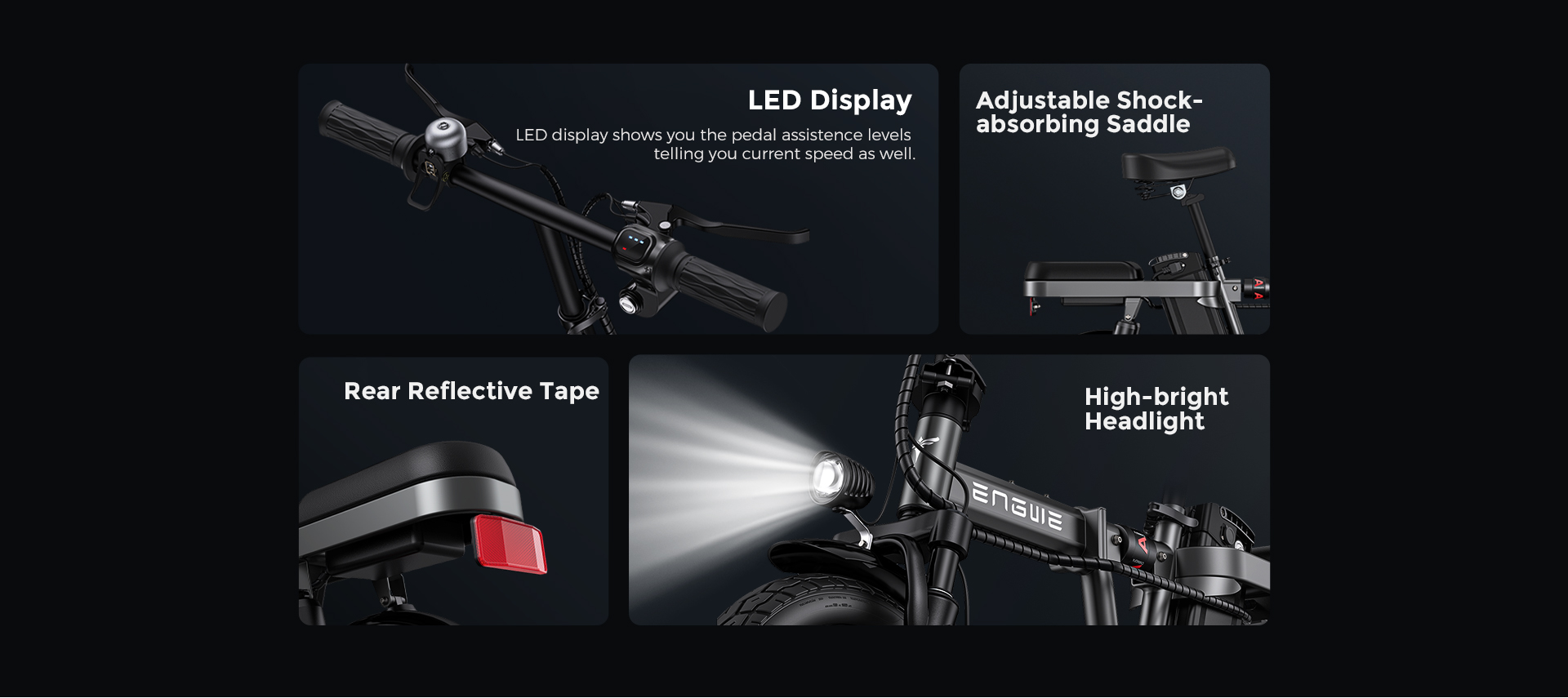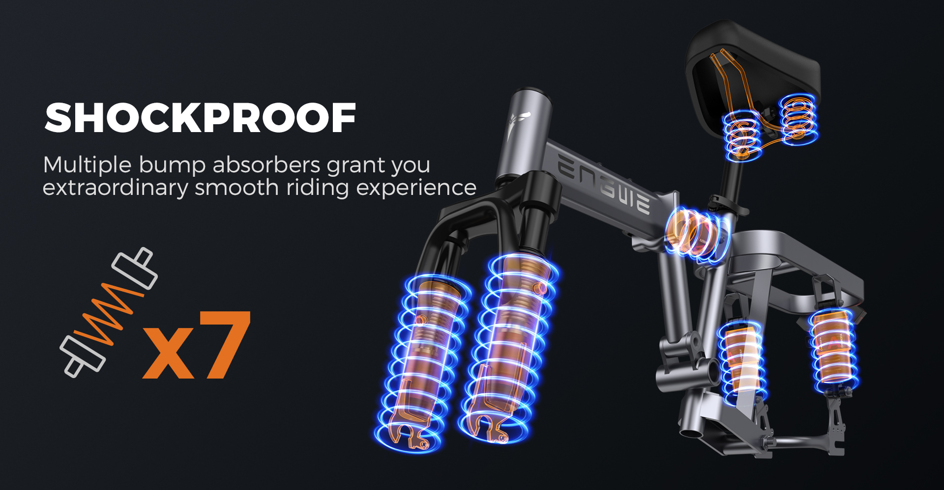 С предна вилка, централно, задно колело и окачване за седалката си, ENGWE T14 осигурява плавно и комфортно каране по различни терени, от градски улици до неравни пътеки.